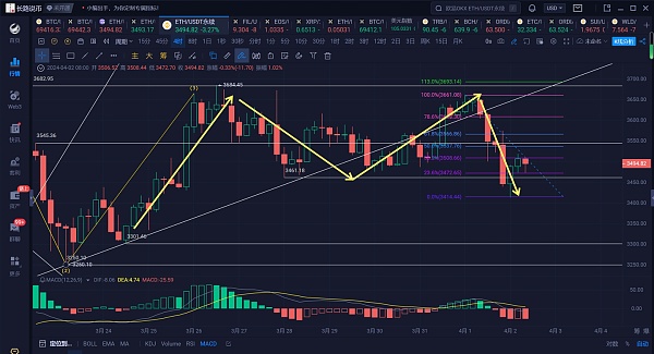 4小时线行情昨天反弹上方高点并未突破前高3685附近回踩,走出M顶的走势,早间回踩下方获得支撑反弹,可关注到反弹是否能突破上方斐波那契回撤线0.5处3540附近的压制,若是突破不了,那么将继续回踩延续M顶走势,1小时线下跌走势也同样走出了5浪回踩模型,现在处于第四浪的反弹浪,若是能走出第五浪,那么将有机会跌破3浪低点。还有十几天就是大饼减半的日子,那么在减半前,可能会迎来一波回踩,然后再走出反弹走势,当然也要注意利好尽头是利空的发生,前以太坊升级就走出了这样的行情,如果你把握不住,那么可以关注长路找到长路。今天操作上长路建议先看反弹,若是不突破上方的颈线位置压制,那么可以空单进场。