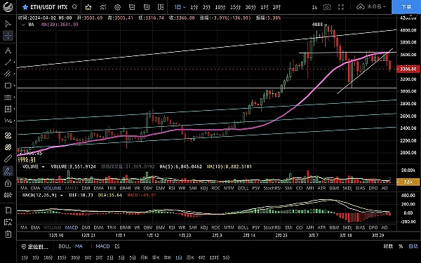 以太坊走势比较明显整体呈小反弹大下跌,早间空头延续最低跌至3315一线支撑反弹,目前币价在3367附近运行,四小时级别k线连阴回落打破今日涨幅,macd空头运行双线死叉向下延伸,走势来看空头比较强势,反弹力度较弱预计四小时开线还有下行的风险,短期多单切勿入场,日线级别行情下行打破窄幅震荡,走势偏弱有跌至ma60均线的预期,下方还有空间但不会太大,稳健可以分批去买入,等待回调结束大概率会加速上涨,上方压制3420-3500,下方支撑3300-3230