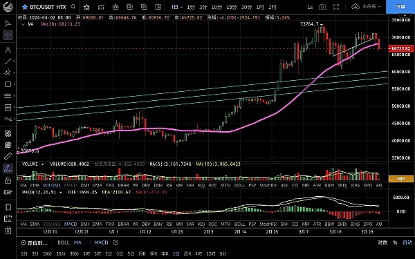 大饼昨日整体呈震荡下跌走势,虽有反弹但力度不大,晚间最高触及70050一线受阻,目前行情再次回落跌至65940一线支撑,短期来看空头走势较强,有二次回踩的风险,只要不有效跌破6w6,行情会逐步反弹上行,四小时级别k线大阴回落跌破多个支撑,macd空头运行双线死叉向下,ma7拐头向下指引,打破短期震荡走势,关注四小时收线若有效跌破ma200则有延续下行的可能,牛市洗盘较多,大周期上涨还未结束,预计盘整后会开启五浪上涨,短期的话关注回调力度逢低买入,上方压制69000-70500,下方支撑66000-64500