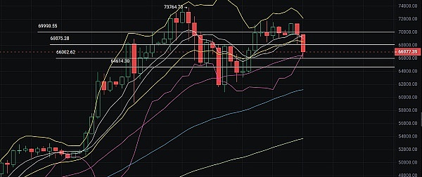 再看比特币行情1小时行情,从昨日的最高点71360处开始走了一个震荡下行,在早间又开始出现瀑布式划水,当前币价下方插针65936后又回到了67000附近;KDJ交叉向下发散,MACD0轴下方开始放量,KC指标下轨在币价上方有意形成压力位;4小时布林带通道大开口,说明币价还会有一个较大的波动,币价当前在下轨线压力位置,KDJ超卖现象严重,MACD下方能量增强,DIF值超-200;DEA接近0值;日线级别来看币价在插针EMA30后形成回调,处于EMA15下方,(KDJ)J值在34.9,如果穿过20,那么币价还会有下调的区间;MACD下方能量增持,DIF继续向下运行;综合上述指标来看,建议上方在反弹第一单高点做空68100,第二阻力位70000;做多第一支撑点66050,第二支撑点65050;行情瞬息万变,文章审核有延迟,建议结合实时盘口变化再进场,建议仅供参考,请把握好风控!