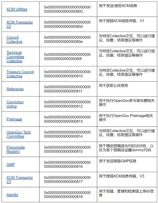 除了增强和扩展以太坊现有预编译外,Moonbeam 还包括了若干专有预编译合约。这些独创性功能正是发挥了 Moonbeam 跨链互操作、融合优势的体现。