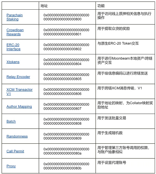 具体来说,Moonbeam 包含以下几个 EVM 原生预编译合约: