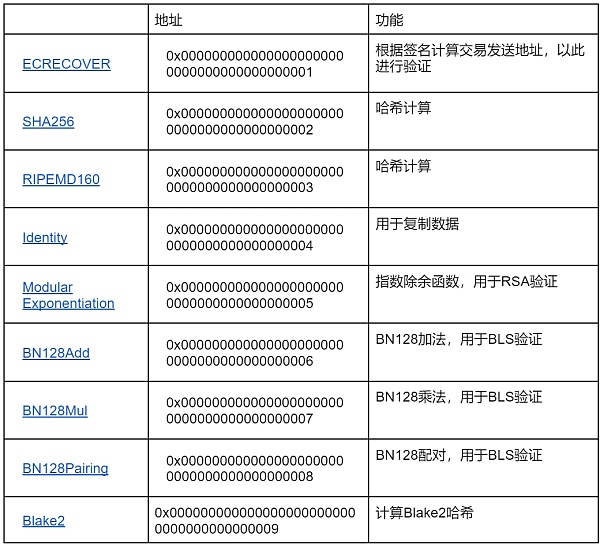预编译合约为 DApp 提供了一些关键的基础功能和加密原语,其中包括: