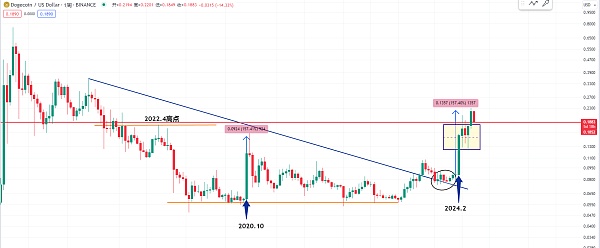 我也有讲过 测距就用2020年10月份的这根K线到2024年2月这个低点的位置 上一次的价格也是很接近这个高点的位置 然后这几天比特币的下跌也会影响狗狗币