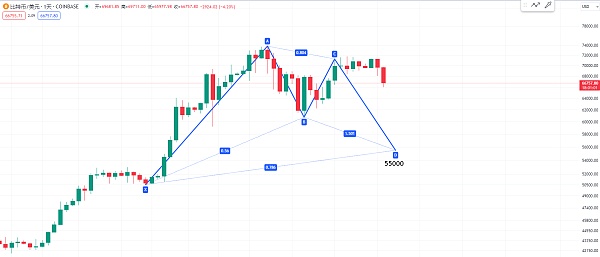 那么现在已经是跌破了这个支撑位 我们就观察一下目前中线级别在这个位置会不会是另外一个比特币看涨的加特利形态 那如果跌得不叫深的话 那么D点0.786的位置大约就是在55000附近 到时候我们再看有没有继续做多的点位