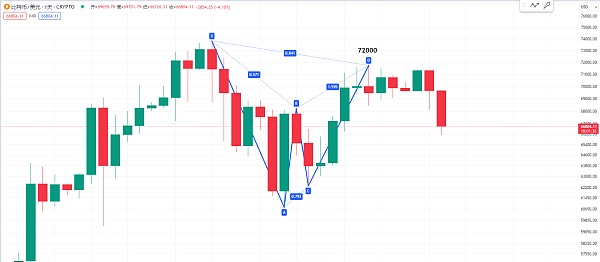 我们先来看一下比特币日线级别 上一周我也在视频里面讲过 比特币在日线级别里面有一个看跌加特利的形态 在加特利D点的位置大约是在72000 然后在上一周也是有几个高点的位置都是接近72000附近 那我们就要小心了 这个加特利形态可能就是一个看跌蝙蝠 而且昨天的一根K线也是一个空头吞噬 他的下影线也是跌到了我给的一个支撑位 大约就是69000到68500的支撑