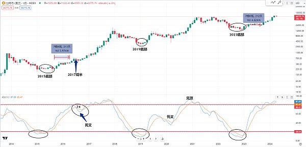 2019年的底部当时的KD指标也是在20的下方 或者是2015年当时的底部 比特币在160美元左右 也是同样 kd指标在20下方 然后我们可以观察一下比特币在2023年的底部 他从这个位置kd指标黄金交叉到目前的位置一波上涨也是历史上最强的上涨