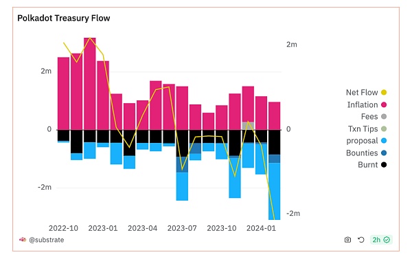 图表显示了从 2022 年 10 月到 2024 年 4 月的时间内 Polkadot 财政流向情况,按净流向、通胀、费用、交易小费、提案奖励以及销毁金额进行了拆分。