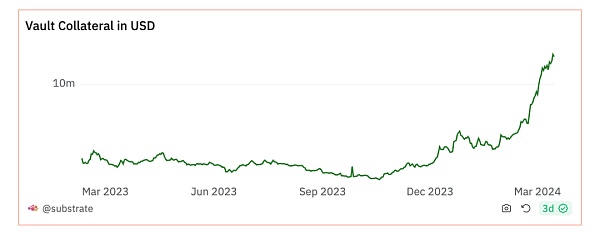 折线图显示了从 2023 年 3 月到 2024 年 3 月期间锁定在 Polkadot 中的 USD 总保证金,随着时间的推移稳步增加,接近 1000 万美元。