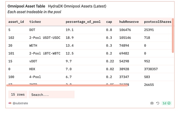 表格显示了 HydraDX 的 Omnipools 资产表,列出了每个资产的资产 ID、票据、池百分比、上限、中心储备和协议份额,这些资产可以在池中进行交易。