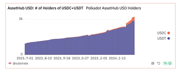 图表展示了从 2023 年 7 月到 2024 年 1 月期间,Polkadot 的 AssetHub 拍下来上 USDC 和 USDT 代币持有人数量的上升情况,达到了超过 2000 位持有人。