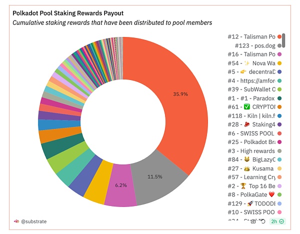环形图描述了已经分配给 Polkadot 池成员的累计质押奖励,Paradox 占 35.9%,CRYPTO0 占 11.5%,其他各种池和验证器占据了剩余的分配。