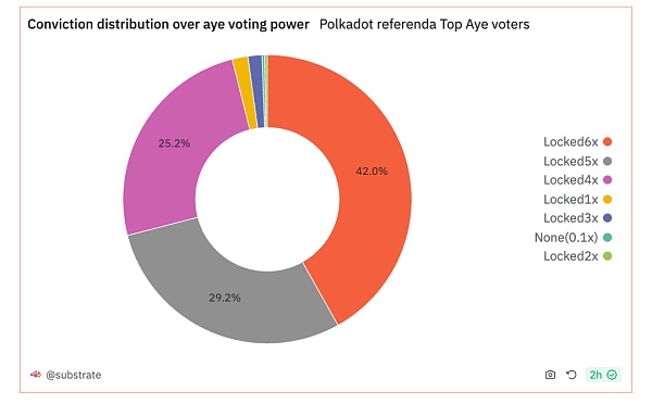 饼图显示了对顶级 Polkadot 公投选民的 Aye 投票力量的信心分布,42% 的投票力量处于 Locked6x 状态,29.2% 处于 Locked5x 状态。