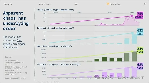 a16z 的《2023年加密货币报告》中的一份引人注目的信息图支持了这一充满活力的复苏,展示了全球对加密货币的蓬勃兴趣。不仅仅是价格在上涨;新想法的涌入、初创企业的增加以及用户基础的扩大,自2012年以来的复合年增长率(CAGR)已经达到了63%到84%之间。这种强劲的增长叙事凸显了加密货币行业的动态演变,也突显了其回弹能力并推动了可能性的界限,同时开启了创新和机遇的新时代。