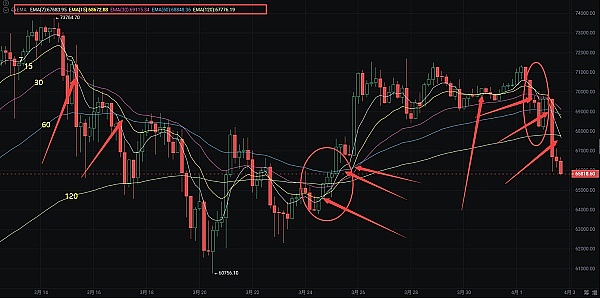 均线交叉:观察不同EMA线之间的交叉情况。当短期的EMA线(如EMA7或EMA15)从下方向上穿越长期的EMA线(如EMA30)时,被称为“金叉”,表示价格可能开始向上走,可以考虑买入。相反,当短期的EMA线从上方向下穿越长期的EMA线时,被称为“死叉”,表示价格可能开始向下走,可以考虑卖出。