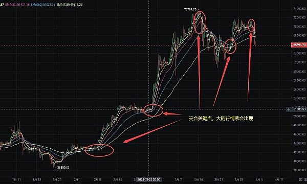 均线的走势:观察不同EMA线的走势方向。如果各个EMA线的走势是向上的,表示价格趋势上升,可以考虑买入。相反,如果各个EMA线的走势是向下的,表示价格趋势下降,可以考虑卖出。