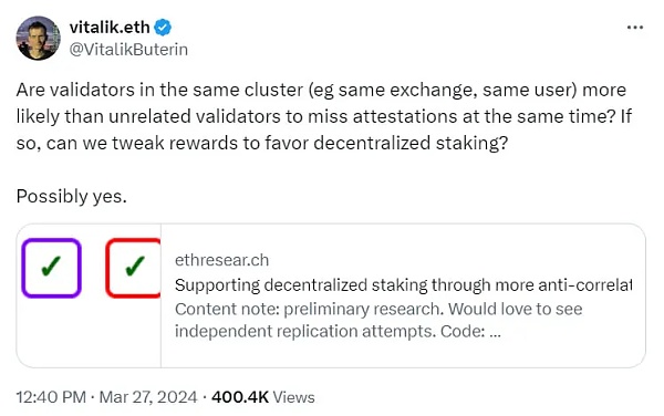 虽然 Vitalik Buterin 认可大型验证者给以太坊网络提供的优势,但他仍试图在大型验证者与去中心化和弹性网络的要求之间取得平衡。3 月 27 日,他提出了“反相关激励”的创新计划,旨在应对在验证者中心化的问题,加大对大型验证者出现故障的惩罚,增强以太坊质押机制的去中心化和公平性。