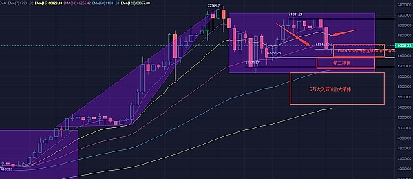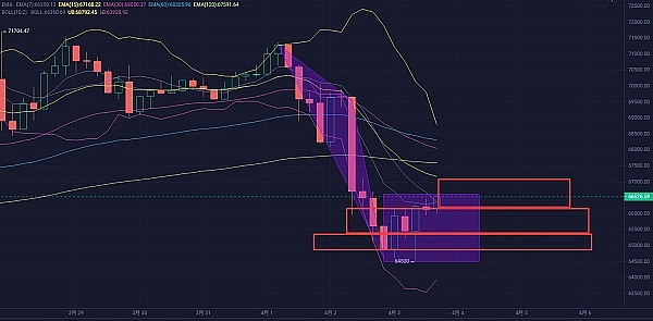 4小时来看布林带通道正在收口,那么收口后,币价就不会有较大的波动,可以参考1小时箱体做短线;再看当前币价处于布林带中轨与EMA7交叉压力位置,EMA15向下穿过EMA120,预示着近期还会有一波回调;综合上述指标可以考虑在EMA7与EMA15区间封高做空,上方关注67100-67500位置空;下方关注66000位置,破位后也可以接空到64900位置;多单需结合实时盘口变化再考虑进场;行情瞬息万变,文章审核有延迟,建议结合实时盘口变化再进场,建议仅供参考,请把握好风控!