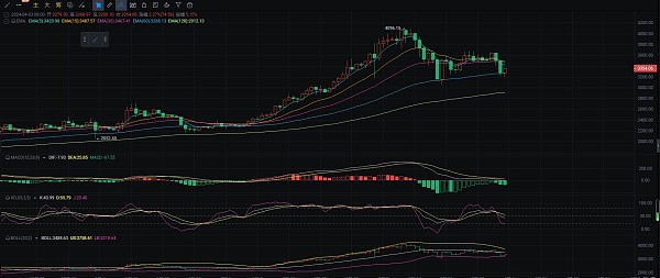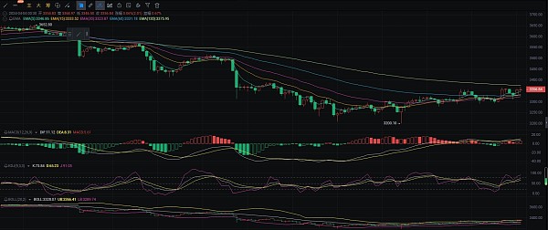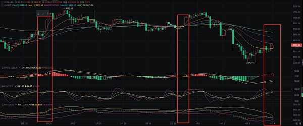 来看日K线,截止发稿前以太坊现价3350附近(4月4号1:00)多头趋势强盛不代表会直线拉升,肯定会扳回回调,目前日K线坐稳在EMA60的趋势指标线3270这个位置,上方EMA趋势指标在重合收口预计会集中在3450附近,这个是需要注意的位置,MACD缩量缩量下行,DIF和DEA形成了两极分化,主力每次都在两极分化的时候结束增筹,KDJ向下开口扩散,布林带收口低头,空闲站立3200指标以后拉伸上行,上方布林带中规压力位3490,和EMA趋势压力位3450形成了40点的区间压力,可以在这个区间选择落袋点,