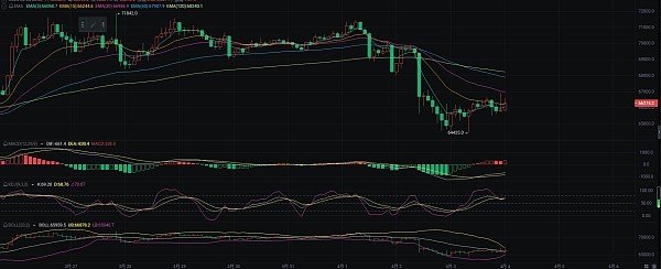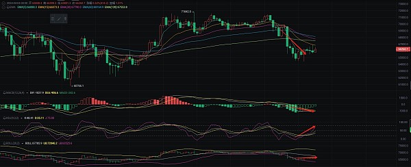 四小时超短趋势来看,K线再一次借力EMA趋势指标,随着EMA10和15的追赶,上方的短期站立点来到了66400附近,压力位关注68000关口,MACD缩量一直在缩量上行,主力也在增筹,KD向上拉伸扩散,布林带开口以后空闲一直在冲击中轨压力点67800,上方关注68000关口的压力位,多个指标都在这个位置重合,所以按照目前价格66300来看,(趋势短多为主)