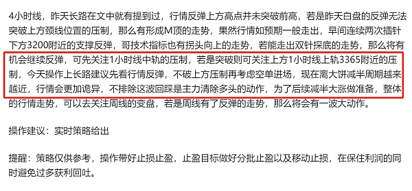 昨天长路在文中和实时策略都给出了行情先看反弹,看上方3365附近的压制,不破可空单进场的策略,跟上操作的朋友,多空都可以拿下一波利润。