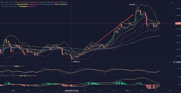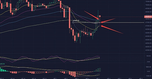 这两天比特币行情逐步回暖,行情也被完美预测,昨日低多65050完美布局;昨天也有提到4小时线上轨线与EMA15在上方形成一个强压,如果EMA15能拐头向上成功穿过上轨线,那么币价还会有上升空间,KDJ也是一个拐头向下的形态,MACD能量缩持,就看DIF与DEA的金叉能否形成,向上越过的话那么就可以考虑逢低做多思路;行情走势再次应证我的分析是对的;再回到4小时线来看,币价从昨日的EMA7与EMA15之间向上突破到了EMA60上方,EMA120与EMA30在EMA60下方形成重合,EMA7向上穿过EMA15接近EMA30处,如果有人看过我前面的EMA指标运用,就知道本轮行情怎么走了,如果这个EMA7和EMA15向上穿过EMA30与EMA120,EMA30向上穿过EMA60;那么币价还就会再次走向大的牛市之中,不过目前来说扯的有点远了!从短线上来看,币价正在震荡回调,操作建议上以低多为主,下方关注第一支撑位67950;第二支撑位67500;上方关注到69500破位情况,再考虑空单入场;行情瞬息万变,文章审核有延迟,建议结合实时盘口变化再进场,建议仅供参考,请把握好风控!