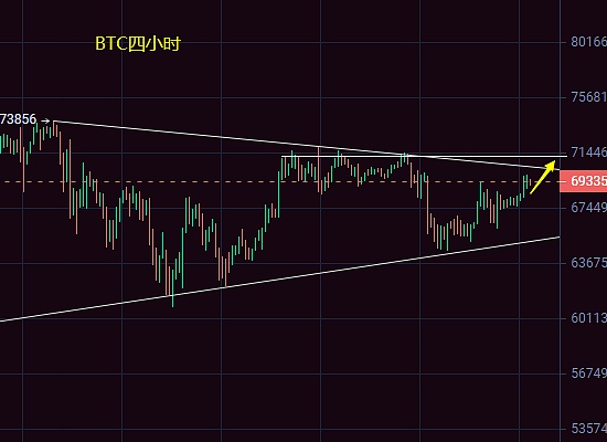 短线上,四小时三角结构震荡,区间逐步压缩,走势震荡偏涨,本周多次在下探后反弹突破,但在区间尚未突破前,阻力尚未企稳前,还是不能过分的去看待多头,毕竟上周吃过多次亏;短线,早间突破69000关口,结合日线本周回踩后的反弹势能,短线上币价有望继续冲击70000关口,早盘咱们冲高看回调,那么午盘,调整后回踩就要做多看涨。