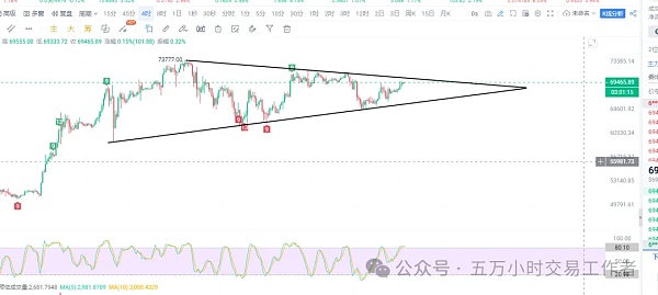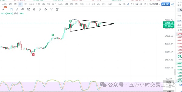 上方关注70450的上方三角形态的压力位置 这个位置突破并且站稳的话还是有很大的概率进行上攻,在一个这个位置马上就把这一周期的行情走到头了接下来要是有向上的需求就关注一下这个70450美元的位置