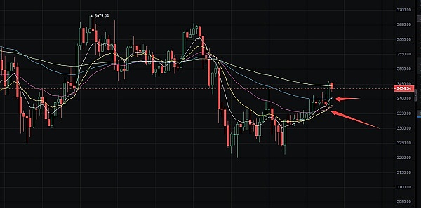 综合上述指标来看,建议先空后多的思路进场,上方在3440附近位置空,下方3370-3385-3400这个3个位置可布局多