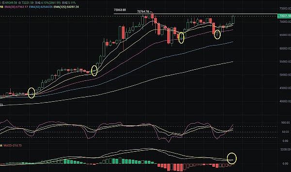 来看比特币4小时线也突破我昨日文章低多布局,上方关注70900,与71000两个位置;当前盘面来看,币价已经向上突破前两次高点,正在冲向历史新高的节奏!从日线图来看,(KDJ)J值刚进入超买区,MACD0轴下方持续缩量上行接近0轴,一旦在0轴上方开始放量,DIF拐头向上接近DEA,如果能形成金叉;那么币价将会有一个较大的突破;建议上方关注73050-73350这个区间能否破位,不破还是可以抓一波空,破位了就会是连续几日的多头热潮了;