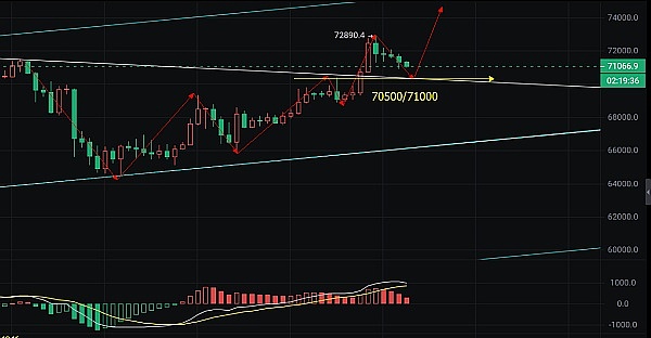 短期出现的回调,仅限于回调,不代表趋势,所以今天的日经级别必须留意5日均线的得失,及上轨的突破状态,若日内无法突破上轨迎来多头的动能释放,那么再次陷入震荡是有可能的,所以70500附近将成为日内的重要支撑,是否可以站稳,是很关键的。而日线上轨将在73000-73500区域,也是暂时日线级别的压力,同时也是前期下跌至6万附近的压制位;