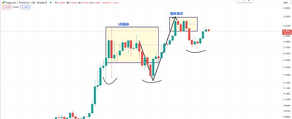 然后我们再来看一下狗狗币的日线级别 就这几天狗狗币已经是把这个箱体的低点给突破了 目前是又回到了这个箱体 所以狗狗币如果是在这个位置短期涨多了 有可能就会盘整 他目前是在强势区 所以我预计在这个位置盘整一段时间之后 有希望继续去突破前面箱体的高点