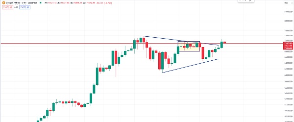 所以目前的这个位置我认为就像之前在25000到26000低点的位置倒过来的一个形态 目前的一个箱体很关键的一个位置就是在71000 我们要留意比特币不能又回到了71000