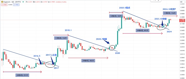 我们先来看一下狗狗币的月线 那我也有发现狗狗币在历史上的下降趋势 底部突破的时间一般会接近29个月 我们可以观察一下狗狗币在2021年5月份的这个高点 到狗狗币这几个高点的位置有一个下降的趋势 然后在这个位置2023年的10月份突破
