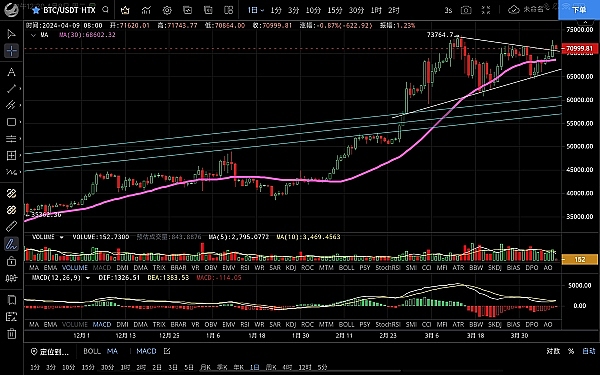 大饼昨日早间走势缓慢且波动不大,底部逐渐抬高,随后多头发力加速拉升,最高至72760附近受阻回落,恭喜跟上思路的朋友多单获利三千点,目前币价在71600附近运行,四小时级别行情上行受阻k线连阴回落,macd多头缩量,下方插针至ma7均线迅速收回,可见多头力度强势,ma7向上指引,若能收在上方行情震荡后会再次冲击前高,日线来看走势验证思路多头比较强势,目前来看还有上行的需求,这波冲破前高预计会到77500附近,低位筹码继续持有,思路保持不变低多为主,上方压制72500-73300,下方支撑71000-70000