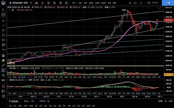 以太坊昨日走势与大饼一致,但整体表现比大饼强势,昨日直线拉升后多头延续碎步上涨,最高触及3726一线受阻,恭喜跟上思路的朋友多单获利三百点,目前币价在3688附近运行,四小时级别多头短期滞涨回落,预计空间不会太大,短期会回踩修复ma7均线,macd多头运行双线金叉向上,走势来看依然偏向多头行情,日线级别k线连阳突破ma30压制,这波拉升远超比特币,这是一个比较好的信号,若大饼突破新高行情进入中期,以太坊势必会强于大饼走出补涨,继续持币等待,保持低多思路,上方压制3730-3780,下方支撑3650-3600