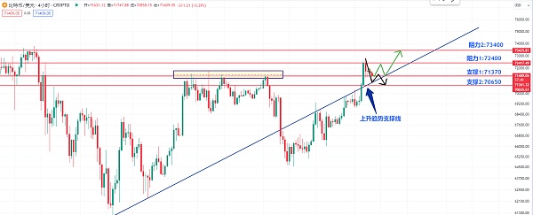 所以在今天的短线交易中,我们可以重点关注71400。作为重要的支撑线,如果下破,预计会出现短期的下跌,另外也需要注意上面我提到的上升趋势线作为支撑。