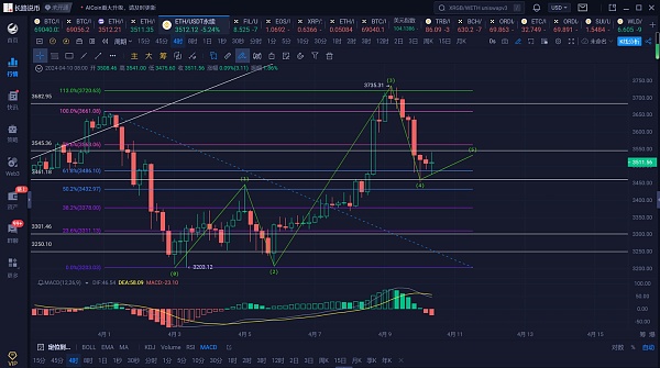 4小时线,昨天长路有提到,行情反弹有走出回调的趋势,若是第三浪无法走出延伸浪,那么就有机会走出4浪回踩。昨天的一波大跌,行情插针了下方斐波那契回撤线0.618处3485附近的支撑,今早更是再次测试下方支撑反弹,从技术指标上看,MACD死叉走势,触及上方中轨压制并未突破再次回踩,整体来看行情有放量下跌的走势,今天操作上长路建议反弹如果不破上方压制可先空单进场,下方关注日线中轨附近的支撑,若是无法走出第四浪的延伸浪,可多单进场。