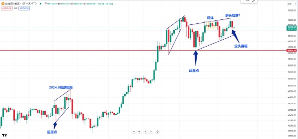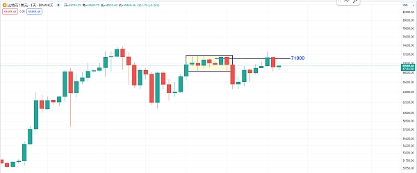 我们先来看一下比特币日线级别 那为什么我昨天会说71000是非常关键的位置 因为跌破了71000其实就是预示着这个位置有可能是上涨的陷阱 因为前面的这一个小箱体的盘整如果真的像多空争夺的话 那么进攻的多头就不能上破了压力区停留或者是又跌回了71000的下方