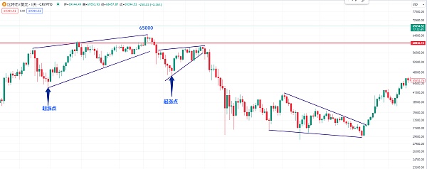 包括当时底部在25000到26000低点的几个看涨的楔形 其实他后面都是回到了起跌的位置 也就是当看涨的楔形上去了之后肯定会穿过这个高点 其实在底部的位置就是这样子 低点的位置主力不断的利用这种看涨楔形的形态 或者是不断的在打压 从而让散户们把筹码交给主力