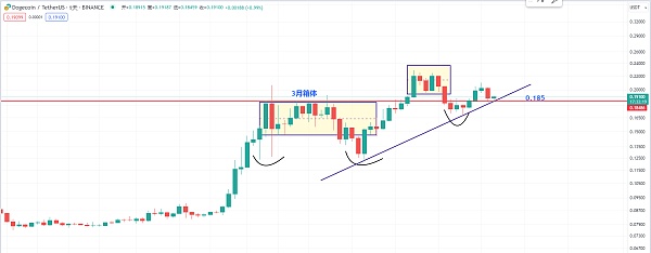 不然我们可以观察一下在0.185附近 也就是之前我说过3月份这个箱体的高点 目前我们就要看在这个位置会不会有支撑 包括目前的这个上升趋势线 狗狗币最好是不要跌破了这条趋势线