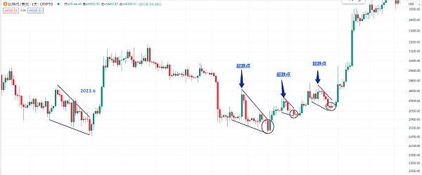 然后后面涨上来之后 这几个起跌的位置最终都会全部突破 包括我们可以观察一下比特币在2023年的6月份 这边也是一个看涨楔形的形态 最终也是回到了这个起跌点的位置