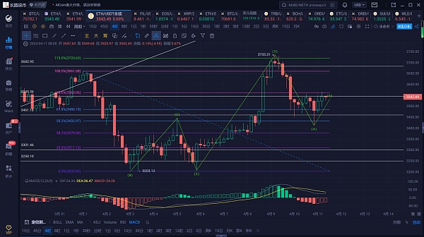 4小时线,昨天长路有说到过行情的一波反弹回踩有走出5浪模型的态势,行情的一波下探走出了第四浪回踩浪,而想要建立5浪模型,需要第五浪反弹高于第三浪,从行情的走势上看,反弹上方斐波那契回撤线0.786处3565附近承压回落,同样也是受到4小时线中轨的压制,MACD处于红色量柱处于缩量的状态,RSI拐头,若是长期突破不了中轨的压制,那么行情将有可能继续回踩下方支撑,夯实基础再反弹,今天操作上长路建议先看反弹若是突破不了上方3565附近的压制可空单进场,下方则关注到3515支撑,跌破则需要关注日线中轨附近的支撑。