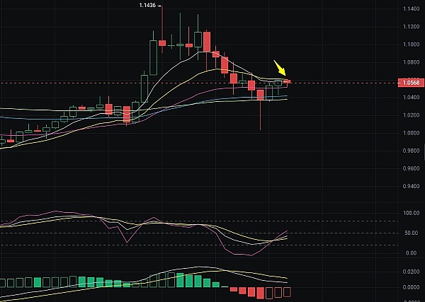 1小时K线在最新一段时间内多次测试1.05支撑位,表明该价位有一定买盘支持。1小时线MACD指标中DIF和DEA均处于负值区域,MACD柱状图由负转正,暗示可能存在反弹或趋势改变的迹象。KDJ指标J值在近几个小时内超过了80,进入超买区间,但随后回落,当前K、D两线仍然高位运行,需警惕回调风险。EMA7在最近几个小时尝试向上上接近EMA30,EMA15与EMA120重合若能成功形成金叉信号,则是看涨迹象。