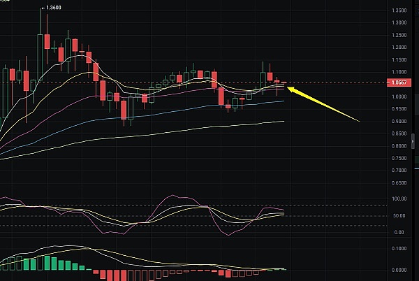 4小时k线昨晚间已形成锤子形态,这是正常的反弹的信号;币价高点测试1.06位置,说明该位置有卖方抛货;4小时MACD指标中DIF和DEA均处于正值区域,MACD下方正在缩量上行,KDJ再次向上接近超买区,EMA受压于EMA15,支撑与EMA30,若EMA7继续拐头向上穿过EMA15,那么币价就会有一个较大的突破;
