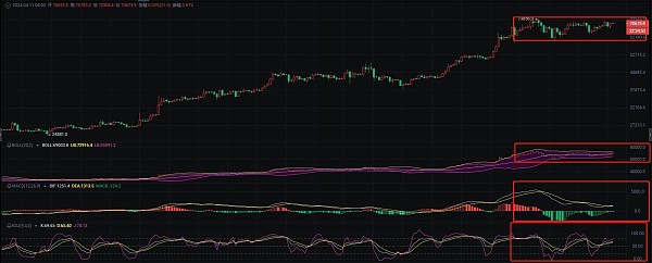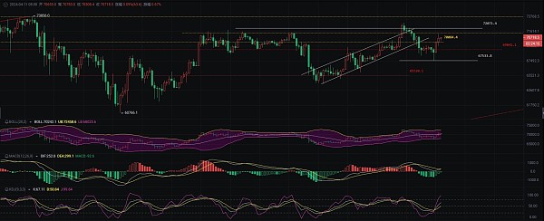 目前EMA趋势指标和之前差不多,在上行拉伸,EMA10抬高到69600,加上昨日回踩支撑EMA30支撑点67700,所以今日回踩到67700的趋势不是很大,但是空头的利润空间还是有的可以抓一波,KDJ受阻77.74值,MACD缩量上行,DIF和DEA高位收口,目前主力一直在增筹,所以我们在做空的同时一定要带好止损位,这样即使行情破位拉伸也不至于错过时机可以顺势上车,布林带整体趋势开始收口,三轨都在上移,下方支撑来到了69000,上方压力给到了73000