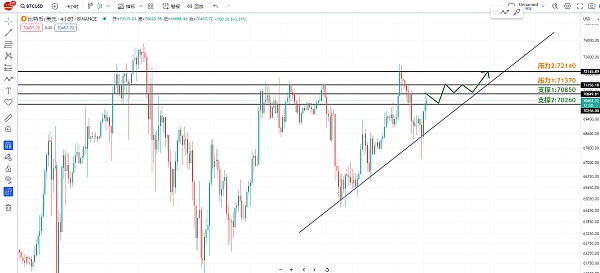 4小时级别阻力位可以参考71370,72140。日内如果当价格突破破第一阻力位之后,那么行情将重新测试72000美元的概率会增加,这也是多头的重要阻力位。目前在上涨的过程中交易量在减少, 因此判断突破的可能性较小, 更有可能则是调整后重新上行。