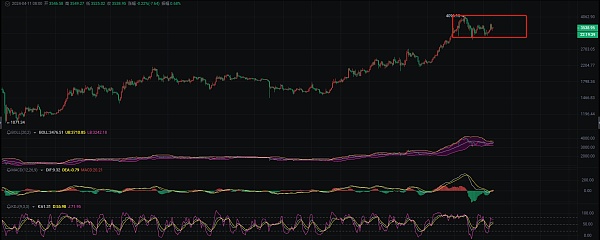 来看今日以太坊盘口,截止发稿前以太坊现价3540,这个价格刚好在周线中心轴的位置附近,多空不定摇摆洗盘的手法,(历史上出现过很多次这种布局,建议低位在开始布局更为稳妥别追多)因为EMA目前的趋势刚成型,三大指标交替已经结束,上方已经冲击过一次3800,短期内会在区间盘整,
