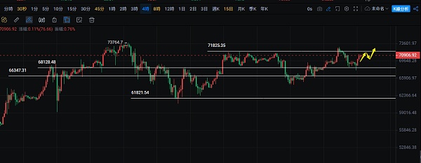 今天直奔主题,比特币昨日晚间来了一波小V拉升,日线收阳,今日5均线支撑仍然关注68000一线,只要白盘价仍处于5均线之上,则单边拉升会持续下去;反之,美盘前盘于5均线下,就可能短期展开调整修正需求;另外,这几天价格也未出现加速狂拉阶段,所以还不急于判断短期顶,若出现修正,可能也会和3月份中下旬走势雷同,以高位箱体抗跌整理修正来对待,时间换空间;比特币4小时级别,前一根K线收盘略微刺破10均线,还需关注这个4小时收线情况;若重新站上短期均线,那么72500/73700高点还会去试探,甚至上穿;反之,继续收阴,连阴了,那么短期就会打压去修正试探中轨67500一线;