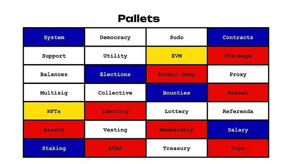 这些 pallets 可以在 Polkadot SDK > Substrate > FRAME 中找到。Pallets 就是 runtime 的构建块。Polkadot SDK 存储库已经预先构建了许多经过审查的 pallets,供开发者放入代码库并立即开始运行。